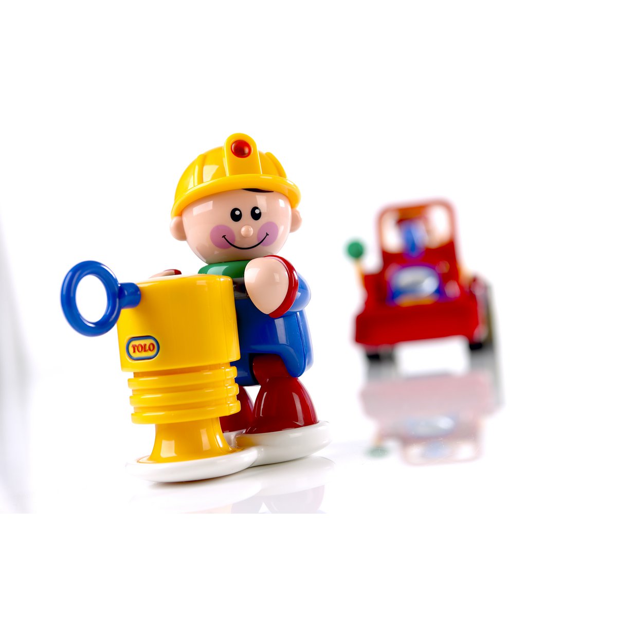 Tolo First Friends Speel Figure – Roadworker with Drill Machinemaak is introduced to the cheerful characters from the Tolo First Friends collection! Discover which parts can move and make a funny clicking sound. What major road projects did this road worker help? Pull the nylon cord and see how the drill machine starts to move up and down! By removing the road worker from De Standaard, the character can also be played individually. His yellow helmet ensures that he can perform his work safely. This play figure contains a push button on his tummy that gives a squeaky sound and is mobile so that the character can take on different poses. The head, arms and legs of the road worker make a clicking sound when you move them. Safe for children where the teeth come through. Part of the play figures with construction theme from the Tolo First Friends collection. The play figures from the Tolo First Friends collection are collecting
